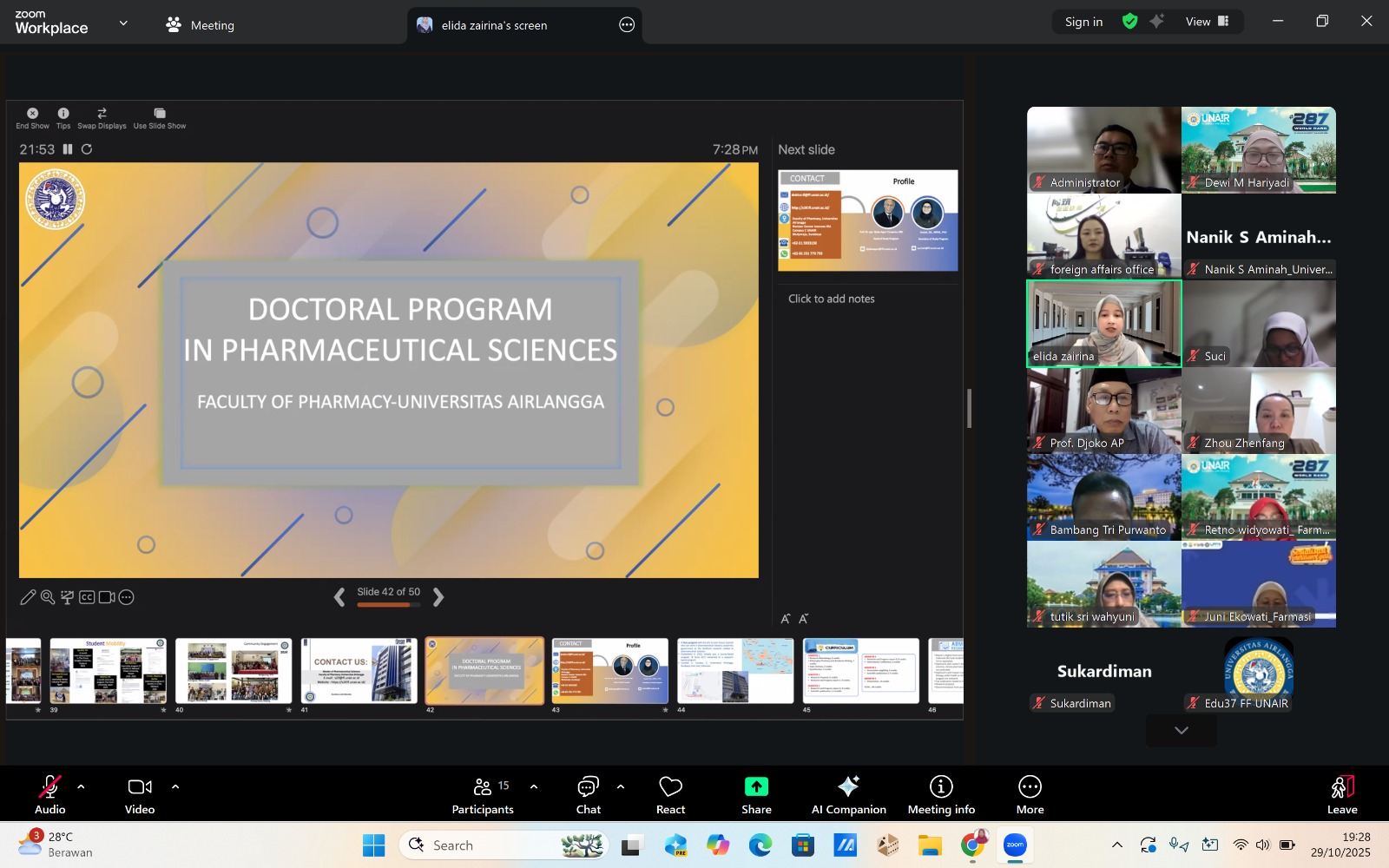Program Doktor Ilmu Farmasi Fakultas Farmasi Universitas Airlangga (DIF UNAIR) melaksanakan kegiatan promosi dan sosialisasi ke Hunan University of Chinese Medicine pada Rabu, 29 Oktober 2025. Kegiatan ini diselenggarakan secara daring melalui platform Zoom Meeting dan berlangsung dengan lancar serta penuh antusiasme dari para peserta.