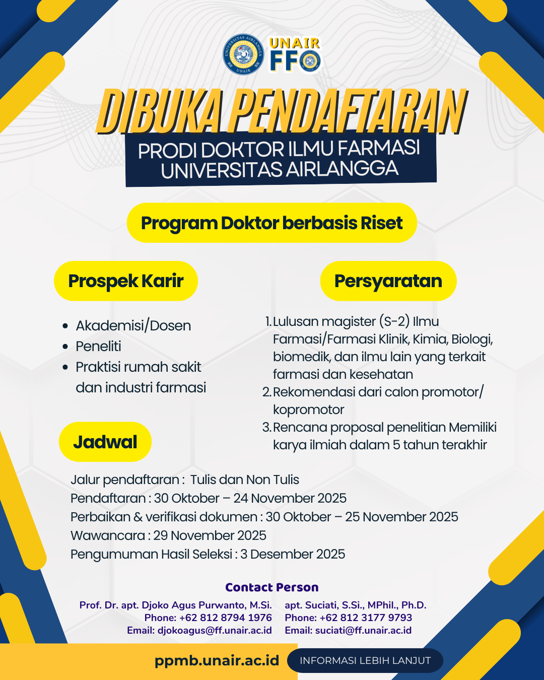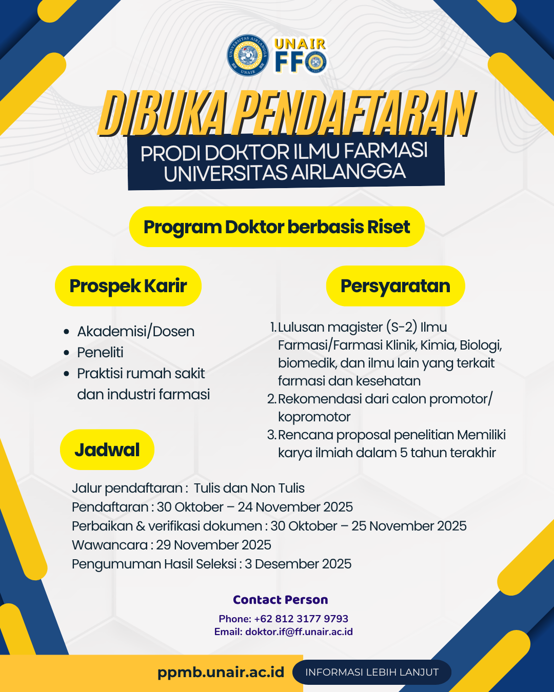Dibuka Pendaftaran Doktor Ilmu Farmasi UNAIR Doktor Ilmu Farmasi Universitas Airlangga 03 Nopember 2025