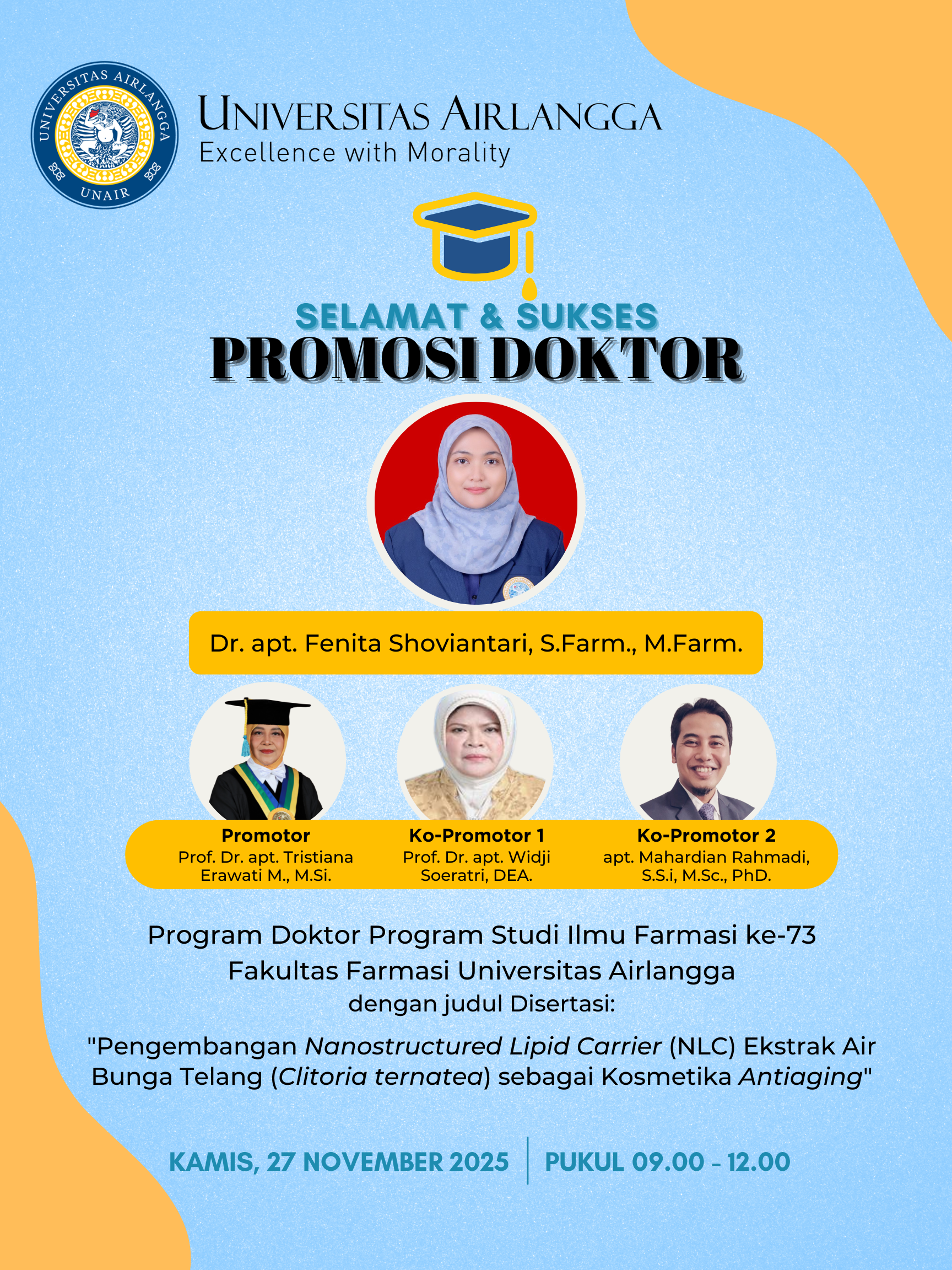 Dengan judul Disertasi: "Pengembangan Nanostructured Lipid Carrier (NLC) Ekstrak Air Bunga Telang (Clitoria ternatea) sebagai Kosmetika Antiaging"