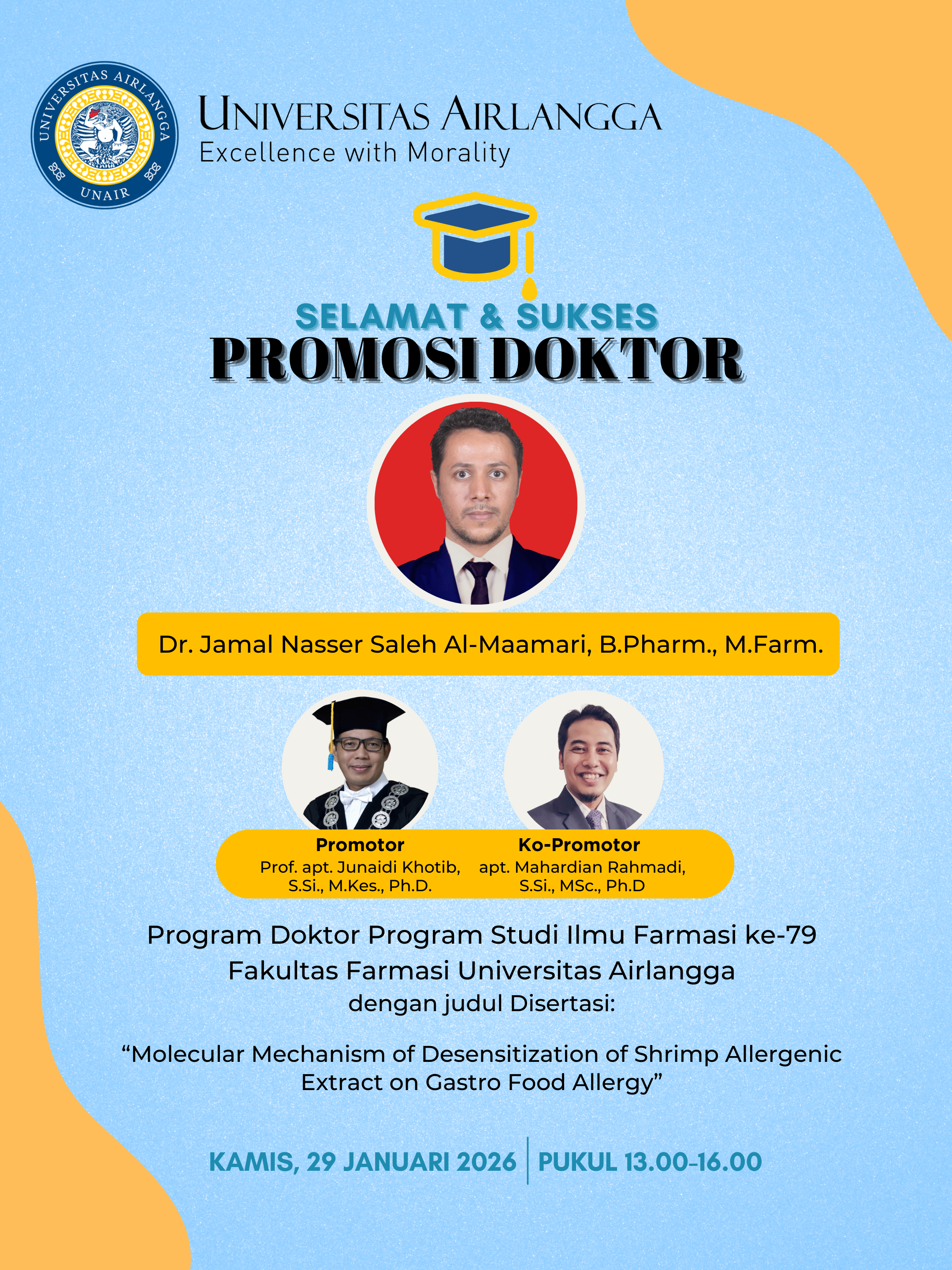 Selamat & Sukses untuk Dr. Jamal Nasser Saleh Al-Maamari, B.Pharm., M.Farm. yang telah merampungkan Ujian Disertasi Terbuka pada 29 Januari 2026.